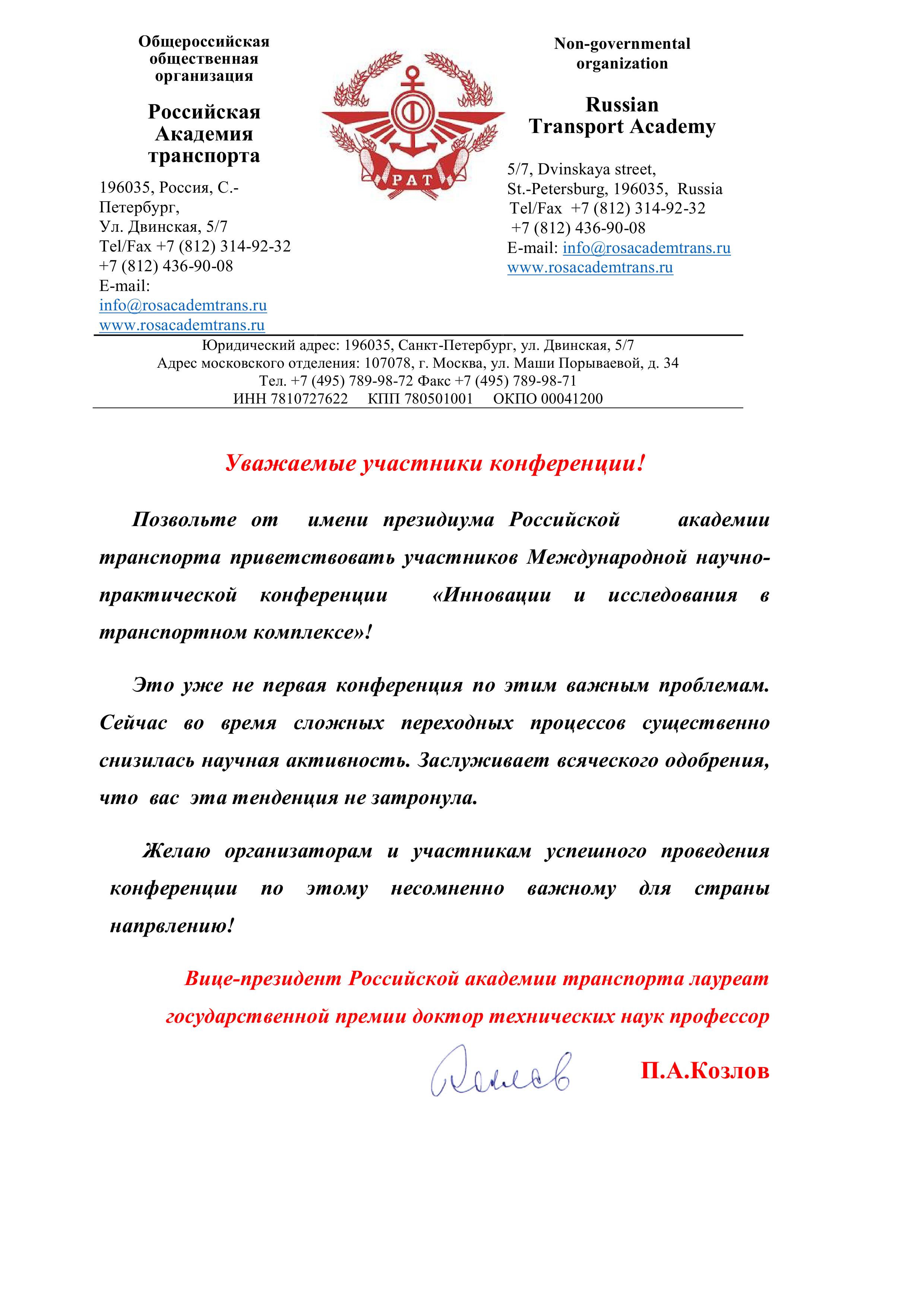 Позвольте от себя лично, а также ученых Уральского межрегионального Отделения Российской Академии транспорта, ученых Уральского государственного университета путей сообщения пожелать успешной работы форуму, который должен способствовать решению нестандартных и сложных задач совершенствования транспорта.