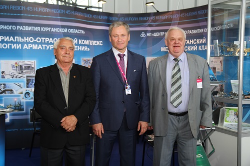 Академики РАТ Харин В.В., Самуйлов В.М. и ВрИО губернатора Кокорин А.Г. у стенда Курганской области